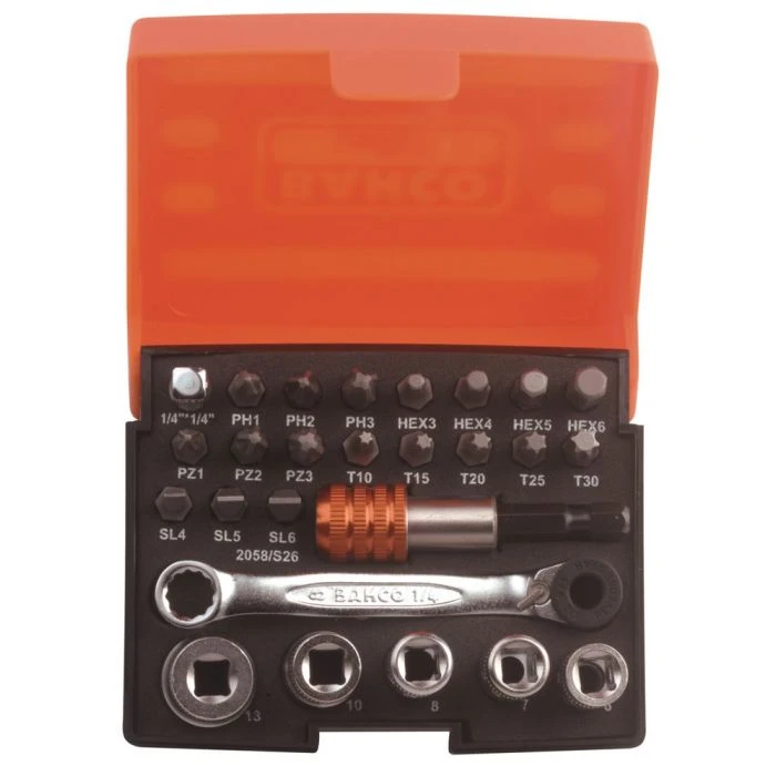 - 26-delige bit- en doppenset: 18 bits + 5 doppen + 1 bit ratel + 1 adapter + 1 bit houder