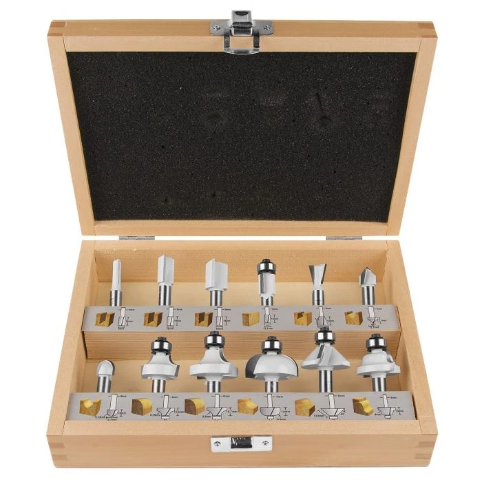 De set bestaat uit 3x groeffrees, kopieerfrees, zwaluwstaartfrees, V-groeffrees, holprofielfrees, 2x kantenfrees met kogellager, holprofielfrees met kogellager, afkantfrees en een lijstprofielfrees.
