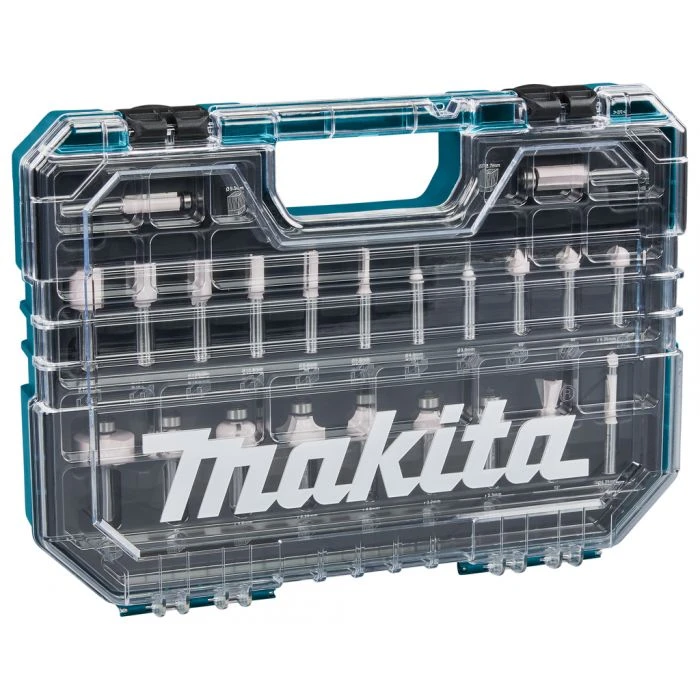 Uitgebreide 22-delige Makita frezenset in overzichtelijke kunststof koffer met transparant deksel.