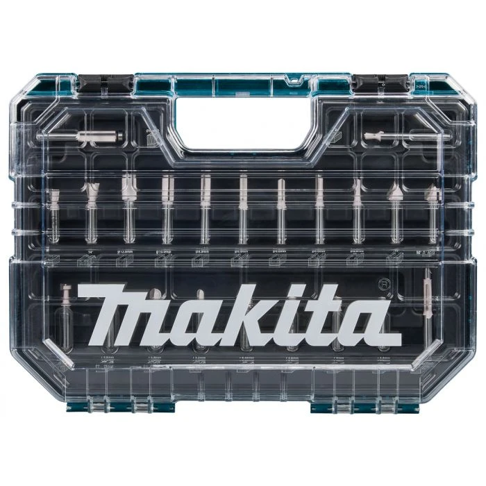 Uitgebreide 22-delige Makita frezenset in overzichtelijke kunststof koffer met transparant deksel.