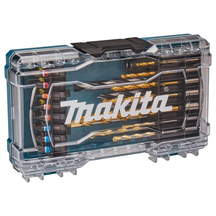 29-delige Makita boor-/schroefbitset in kunststof cassette bestaande uit een 16-delige schroefbitset 25mm, 12-delige borenset hout/steen/metaal en een magnetische snelwissel bithouder.
