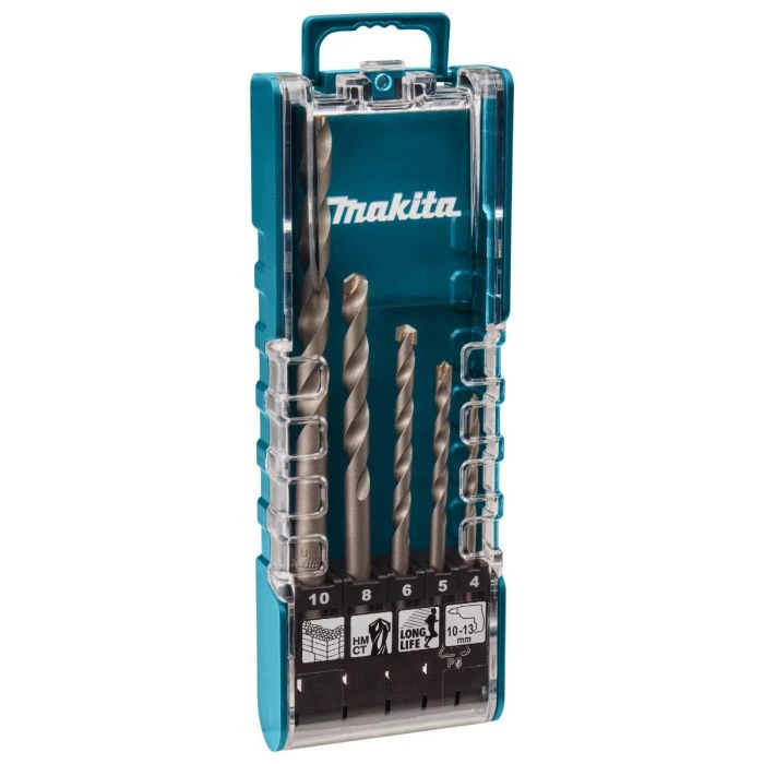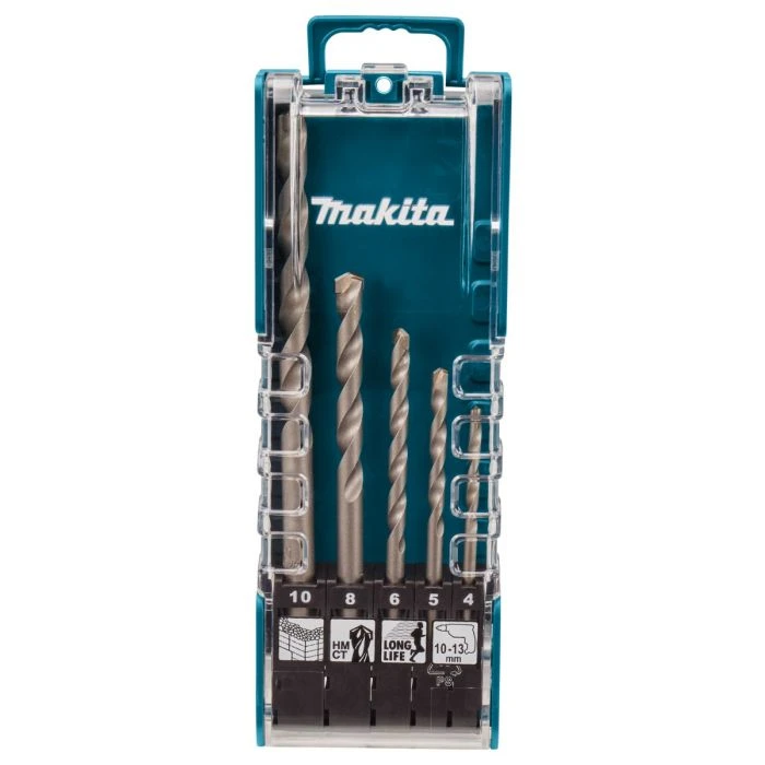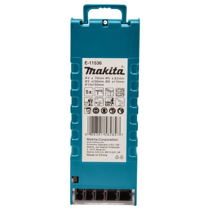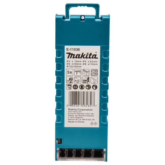 5-delige set met cilindrische opname, bestaand uit boren in de afmetingen 4x70mm – 5x85mm – 6x100mm – 8x110mm – 10x150mm.