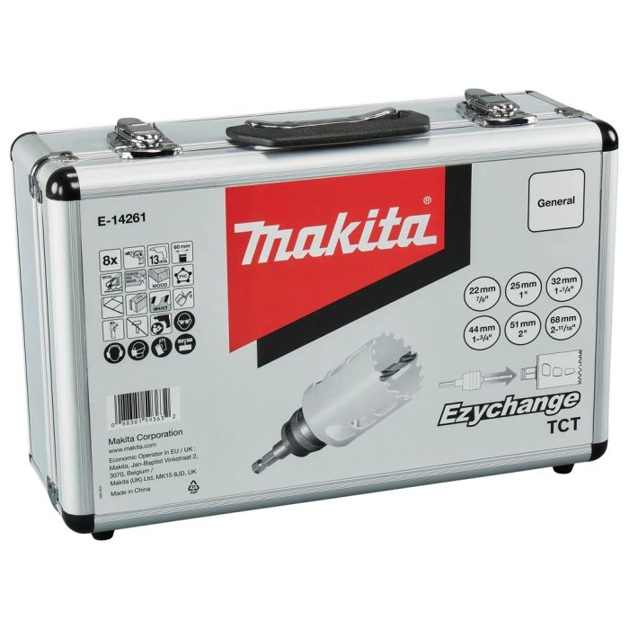 Makita TCT gatzaagset met Ezychange snelwisselsysteem; dit systeem maakt het mogelijk snel en eenvoudig te wisselen tussen gatzagen met verschillende diameters.