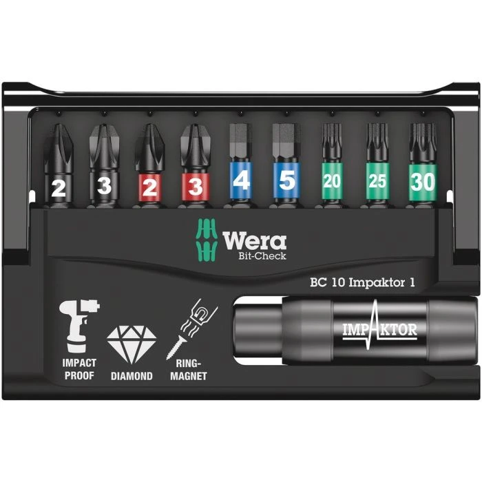Robuuste Bit-Check van Wera. Bij Bit-Checks heeft u steeds een goed overzicht over het beschikbare gereedschap. Bits die niet nodig zijn voor de werkzaamheden, kunnen in het assortiment worden teruggeplaatst en raken zo niet kwijt. Eenvoudig mee te nemen, bijv. in een borstzak. De Impaktor-technologie zorgt voor een bovengemiddelde gebruiksduur ook onder extreme situaties. Verhoogde wrijvingsweerstand dankzij ruwe diamantdeeltjes op de bitpunt voorkomt het wegglijden uit de schroef. Uitermate geschikt voor gebruik in combinatie met conventionele impact- en slagschroevendraaiers. Impaktor-houder voor het afleiden van extreme belastingspieken. Bijzonder torsie-effect dankzij dubbele torsieveer. Met ringmagneet om ook lange en zware schroeven eenvoudig op de plaats te houden, ideaal voor werkzaamheden boven het hoofd. Uitermate geschikt voor gebruik in combinatie met conventionele impact- en slagschroevendraaiers. Magneet kan teruggeschoven en daarmee uitgeschakeld worden.