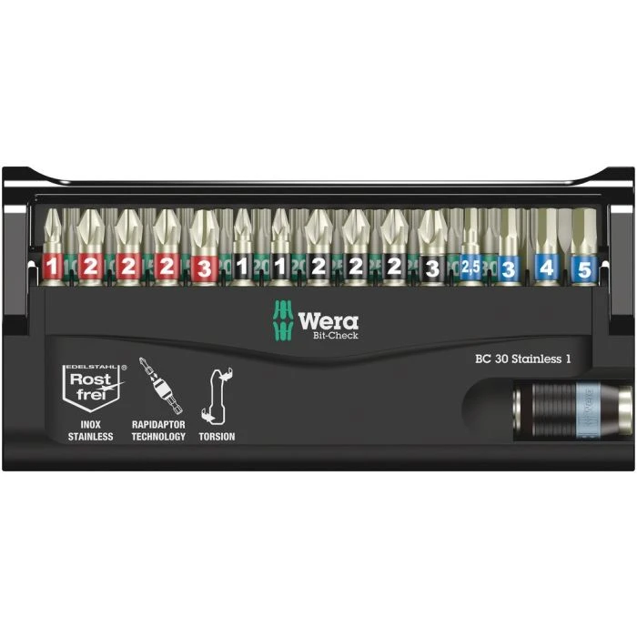 Neerzetbare Bit-Check met hoogwaardige RVS bits. Wera RVS gereedschap wordt gemaakt van RVS, waardoor lelijke vliegroest wordt voorkomen. 29 Wera RVS bits. 1 RVS Rapidaptor-snelwisselhouder. De meerdelige Bit-Check overtuigt door het lage gewicht en uitstekende compactheid. Daarbij zorgt het zachte materiaal in het onderste gedeelte van de Bit-Check voor een betere houvast voor de bits en maakt tegelijk het uitnemen daarvan makkelijker. Het profiel en het formaat van de bits zijn gemakkelijk te herkennen dankzij de Wera ‘Take it easy’-Toolfinder met kleurcodering en duidelijk zichtbare beschrijving.