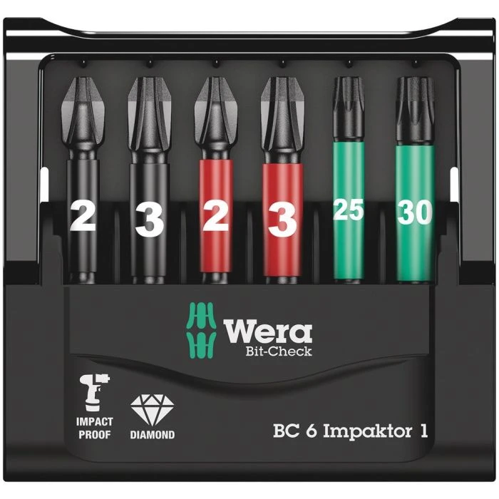 6 Wera Impaktor-bits, overzichtelijk en compact gerangschikt in handige Bit-Check. Bij de Impaktor-technologie wordt zo optimaal mogelijk gebruik gemaakt van de materiaaleigenschappen en is de geometrie volledig aangepast om langdurig gebruik mogelijk te maken, zelfs onder extreme werkomstandigheden. De bitpunt is voorzien van minuscuul kleine diamantdeeltjes die zorgen voor een hogere wrijvingsweerstand en zo het risico op wegglijden uit de schroef verkleinen.