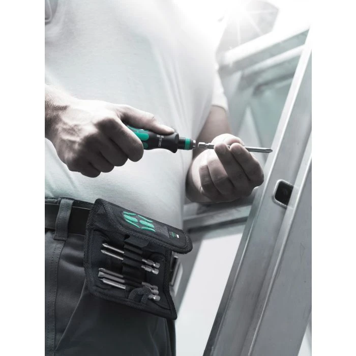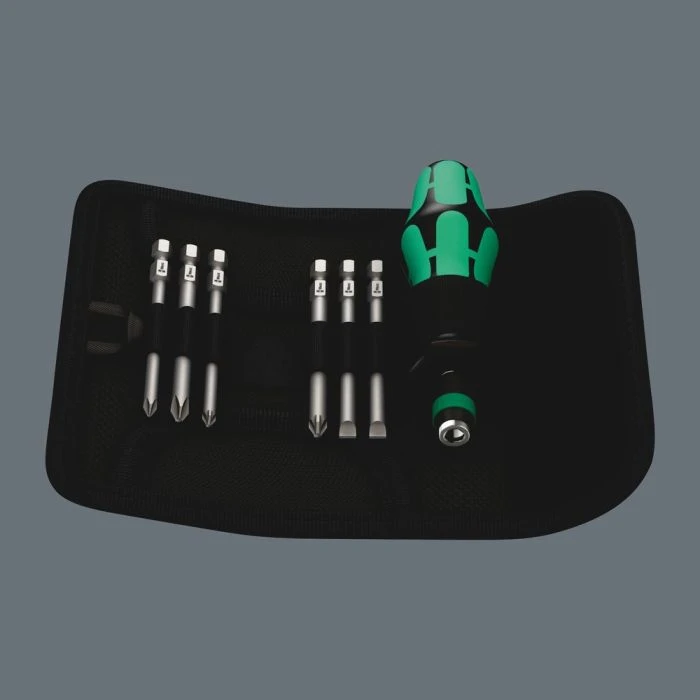 Vouwetui met 89 mm lange bits. Inclusief handhouder 816 R Kraftform met snelwisselfunctie ‘Rapidaptor’ en meerdelige Kraftform handgreep voor vermoeiingsarm werken.